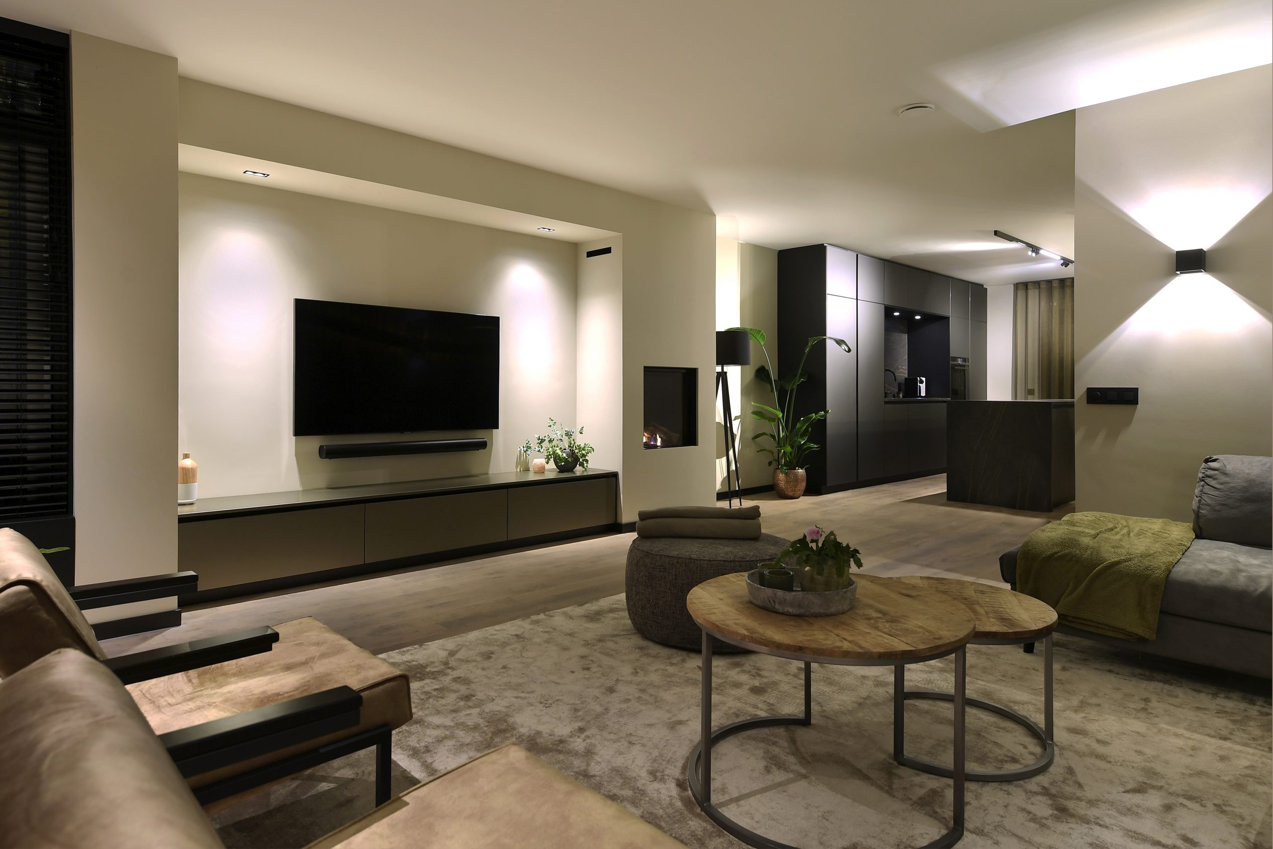 Daarnaast hebben wij het op maat gemaakte tv-meubel verzorgd en het lichtplan. De stijl van de keuken is doorgetrokken naar het tv-meubel om de harmonie op de benedenverdieping te behouden.